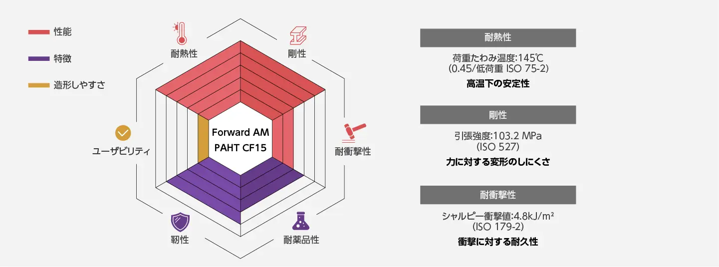最高クラスの耐温性 / 高靭性 / 剛性 / 良好な表面品質 / 研磨性