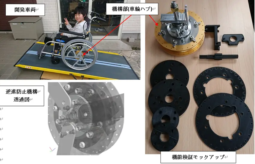 開発品の車椅子の車輪には、傾斜による後退を自動で制動する機構を内蔵しています。坂道の途中で漕ぐのをやめても自動で止まるため、安全に坂道を上ることができるようになります。この制動機構の設計にあたっては、組み込まれる部品の配置が重要になるため、複数案を一度に3Dプリンターで試作して評価し、開発期間とコストを大幅に削減しました。