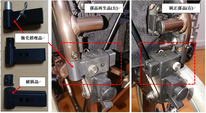10年以上前に生産終了となった高機能車椅子にて、位置調整機構の部品が破損しました。メーカーは既に部品供給終了していたため、3Dプリンターにて部品を再生して修理対応しました。福祉用具は利用者にとって代替が効かない場合があり、このような修理依頼がありました。