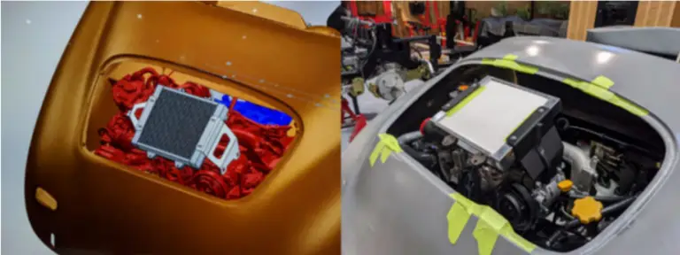左:3Dモデルのインタークーラーブラケット 右:インタークーラーの位置を確認するための黒いASA3Dプリントプロトタイプインタークーラーブラケットフルサイズの車両スキャンに基づく小型モデルは、ペイントサンプルガイドとインテリアトリムコンフィギュレーターに使用されます。 これらの小型車は、潜在的な顧客が内部の革のサンプルを交換できるように設計されています。