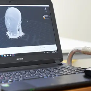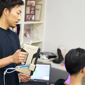 髪の毛をキャップで覆うなど簡単な下準備をしてスキャン開始。頭部のスキャンであれば、5分程度で終了できます。安全性も高く、白色光(可視光)を光源としているため、眼球への悪影響もありません。顔や体の部分データ取りこむ他、直接型取りのできない、一点物の造形物のデータ保存などにも利用できます。
