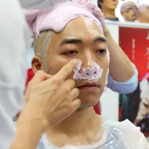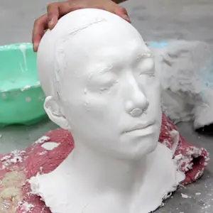 役者の型取りに関しては、従来ではアルジネイト(歯医者で歯形をとるときに使用するもの)を顔に塗り、バンテージでバックアップするという方法で40分~1時間かけて型取りをしていました。