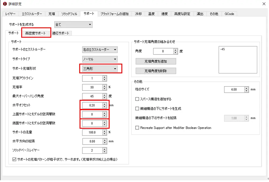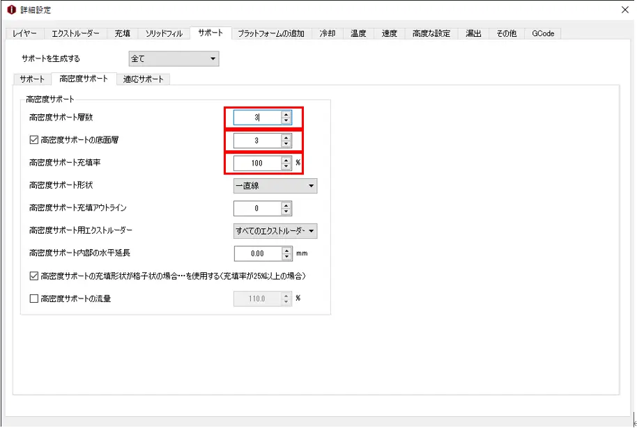 高密度サポートとはモデルとサポートが接する面の充填密度を高くすることでモデルの底面がサポートの隙間への垂れて崩れてしまうのを防ぐ設定になります。