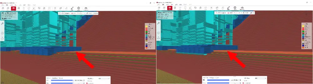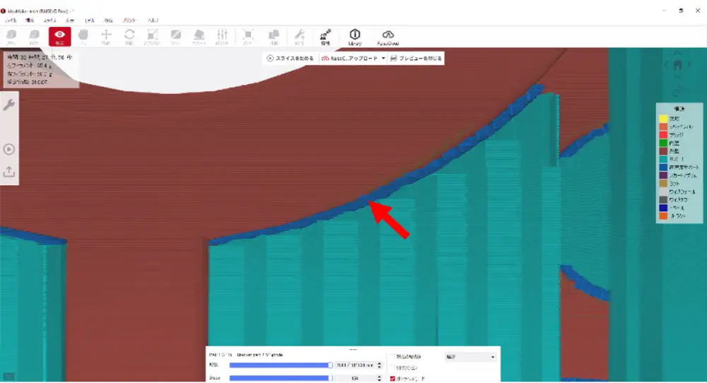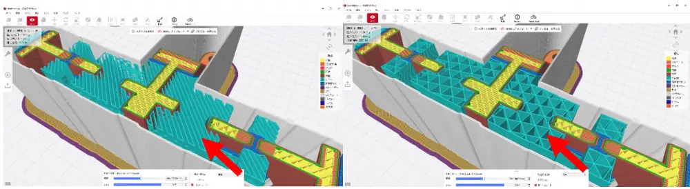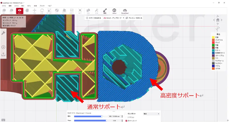 (水色の部分が通常のサポートになり赤矢印部分にある青色の層が高密度サポートになります。)