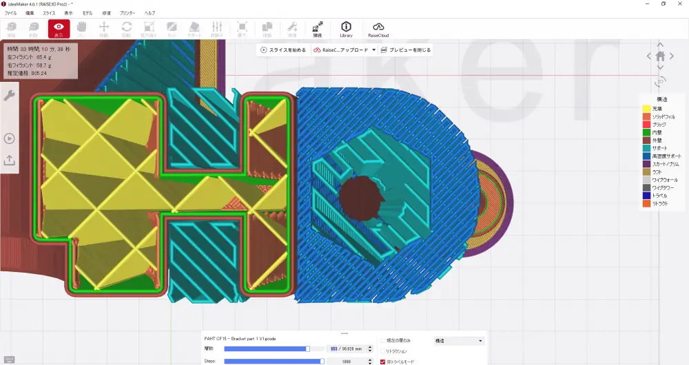 他にもBASF製BVOHやHiPSといった溶解させてサポートを除去するフィラメントがありますが、いずれも通常の造形よりも難易度が高くなります。造形時間も通常より2~3倍以上の時間が掛かることから失敗のリスクは極力無くしていきたいところです。