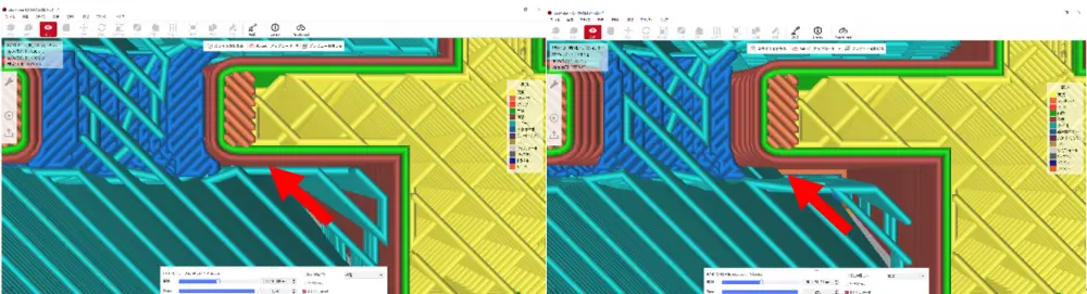 造形時間は長くなりますが水溶性サポートの定着性が上がる為、造形失敗を防ぐ為の効果的な設定になります。