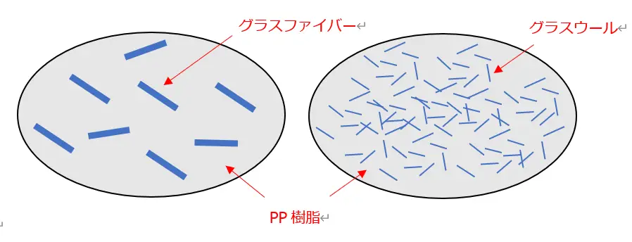 ナノダックスのグラスウールは従来のグラスファイバーに比べて繊維長が短く、繊維径が細いことからキメ細かくPP内にファイバーが充填されています。