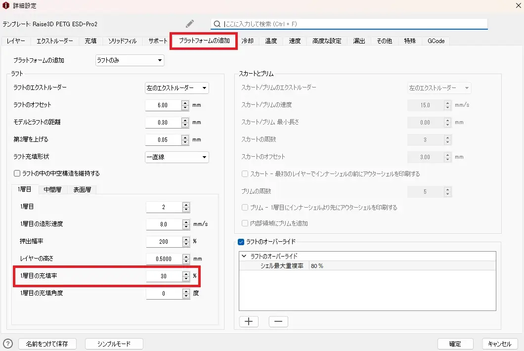 ※25%よりも下げてしまうとラフトが正常に造形されない場合がある為、注意してください。