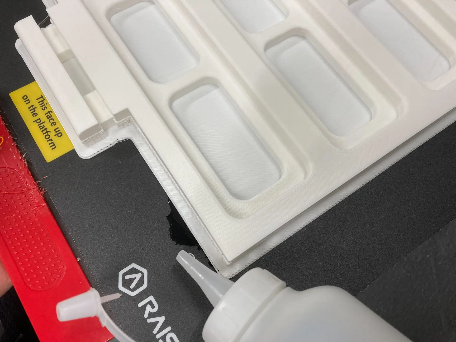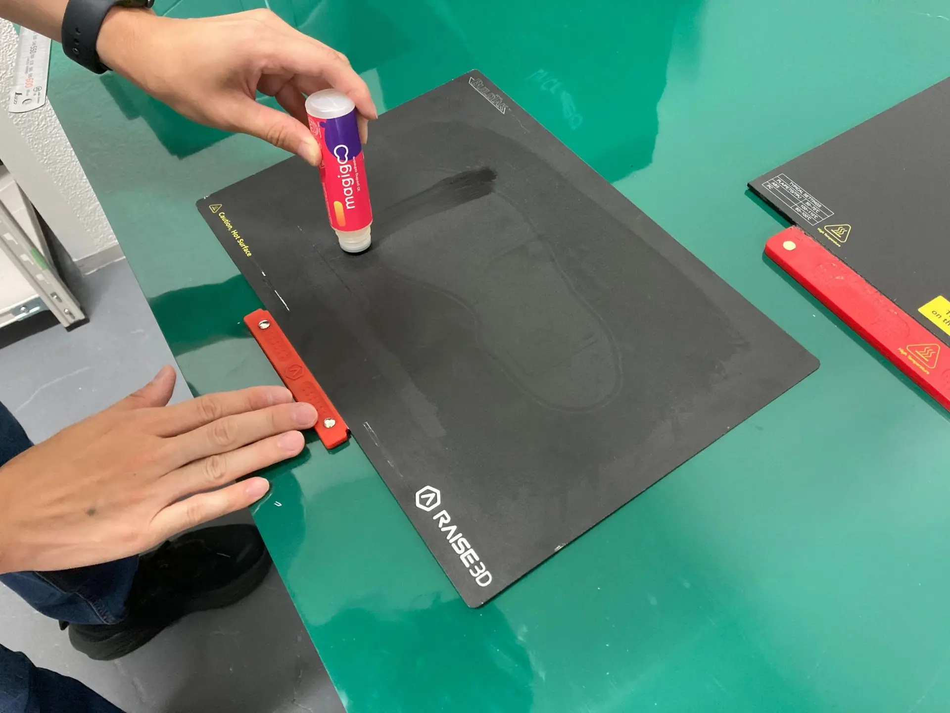 Magigooは3Dプリント用に開発された専用のりで液体はサラサラで塗布しやすく、造形中はプリントベッドの熱に反応して定着力が上がり、造形後にプリントベッドが冷めた状態になると剥がしやすくなる特徴があります。