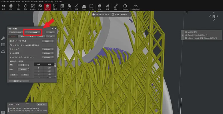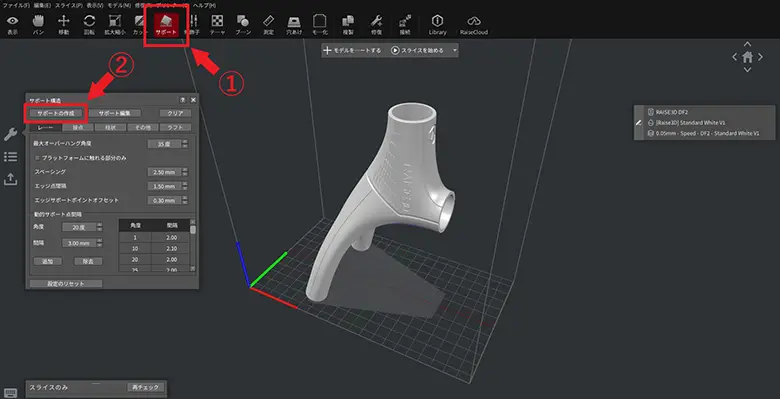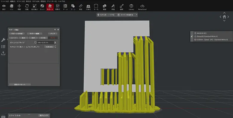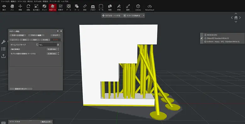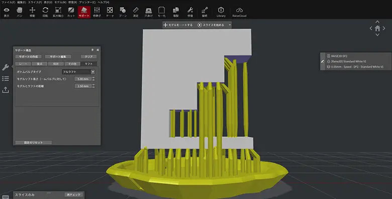 クリックすると画面左側のスパナのマークから「サポート構造」のポップアップが表示され左上の「サポートの作成」をクリックすると自動的にサポートが生成されます。