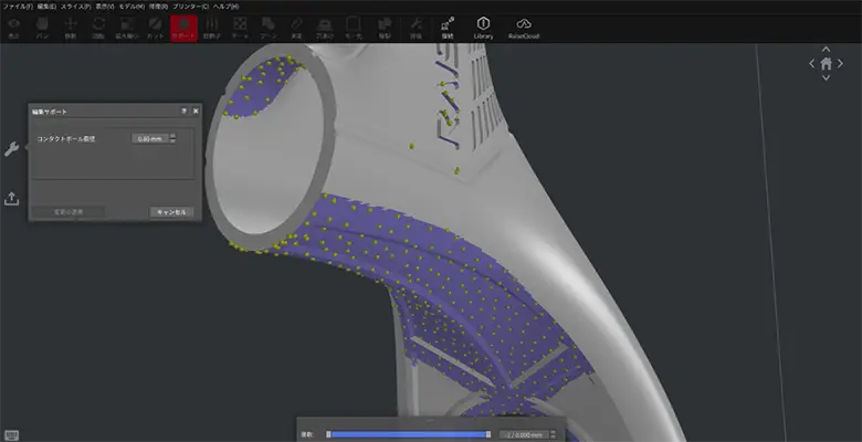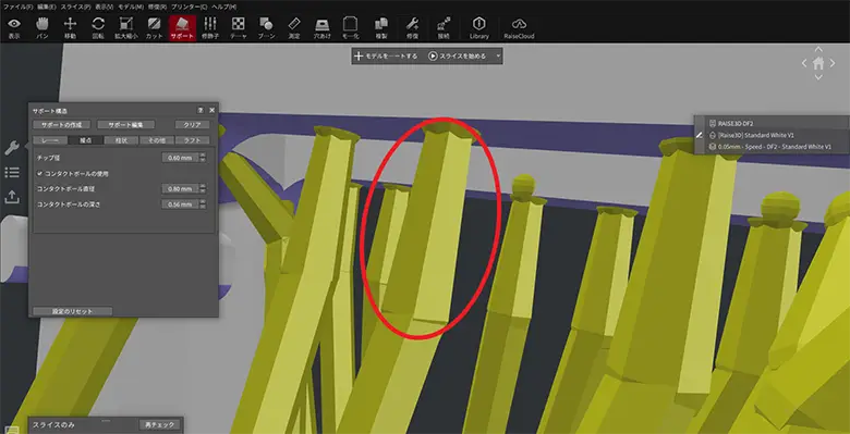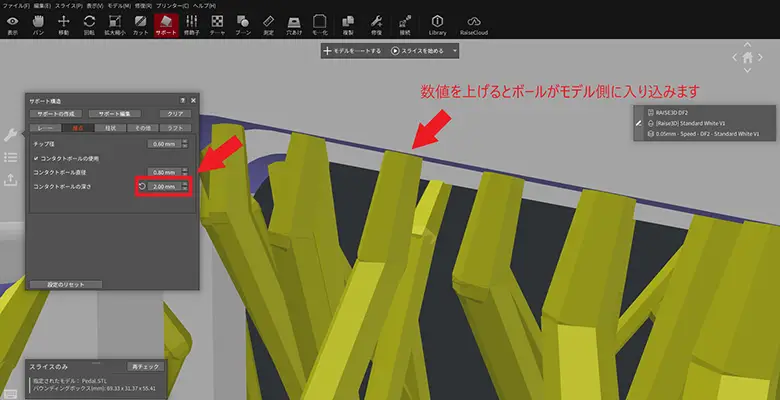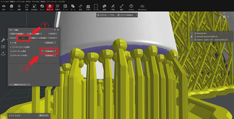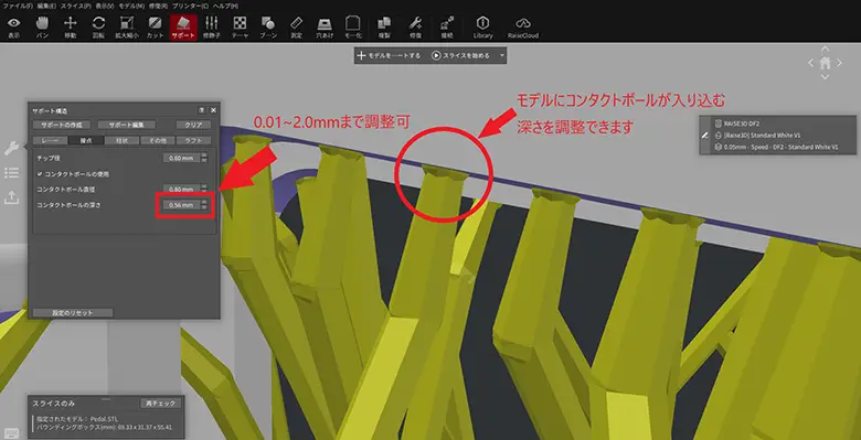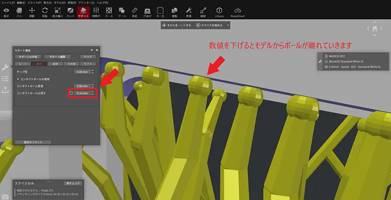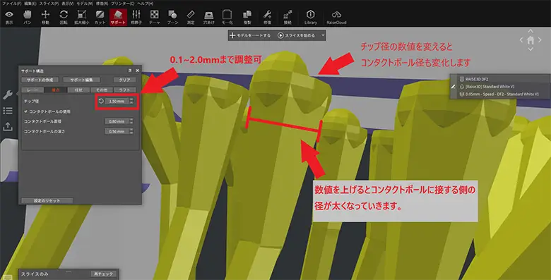 「接点」の項目にある「コンタクトボール直径」でモデルとサポートが触れるタッチポイントとなる球体部分の大きさを調整することができます。