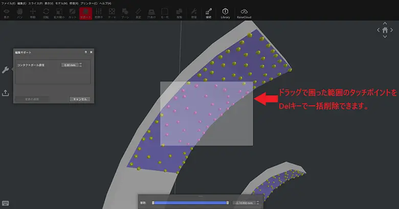 このタッチポイントをクリックすると一個単位でサポートを削除することができ、任意の場所にサポートを設置することもできます。