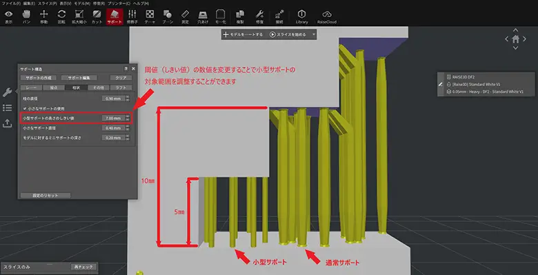 小型サポートはモデル上から生成される部分に限定され、モデル間の閾値に収まる範囲から自動的に切り替わる仕組みとなっています。