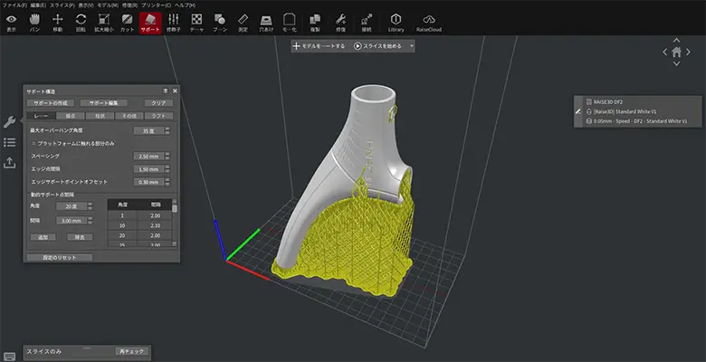 ideaMakerにはFFF方式のPro3やE2シリーズと同様にソフトウェアが自動的にモデルの必要な個所にサポートを生成する機能があります。