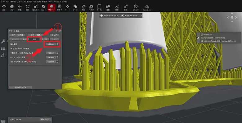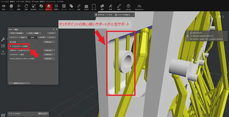 小型サポートとは特定の条件箇所に対して通常のサポートよりも細いサポートを生成する機能です。通常のサポートよりも細く造形される為、サポートが外しやすく痕が残りにくいメリットがあります。