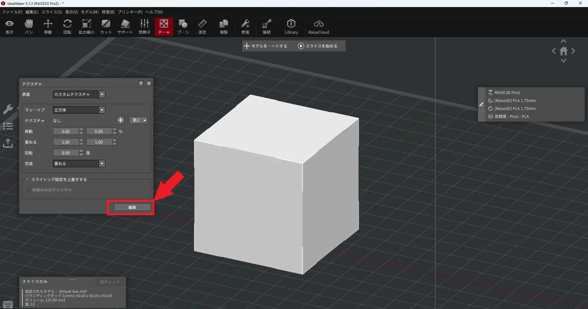 片側1面にのみテクスチャを貼り付けたい場合はテクスチャの項目の下にある「編集」をクリックします。