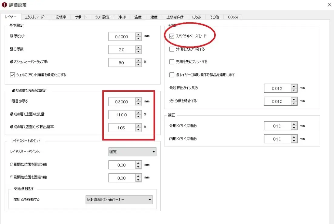 ビルドプレートの定着を安定させる為、最初の層の設定(右の赤□)の数値を変更します。