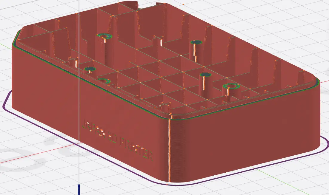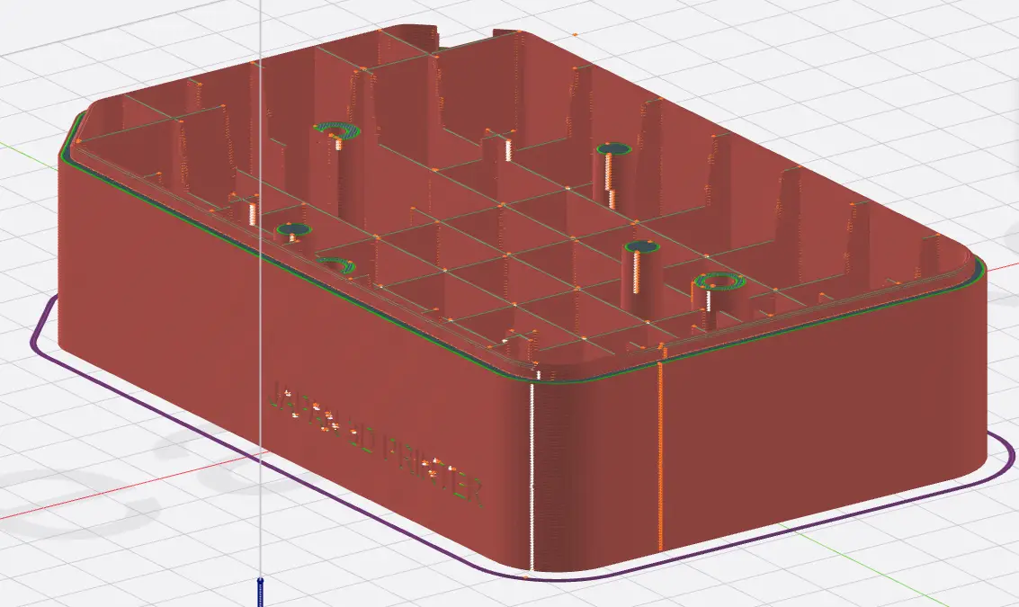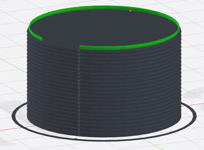 下記画像は同モデルのスライスです。白線で示される層の開始点と、オレンジ線の終了点が重なっていて、その部分が溝になっています。材料や造形条件によって、溝ではなく、逆に凸形状であったり、ひげ状にフィラメントが突き出たりする場合もあります。