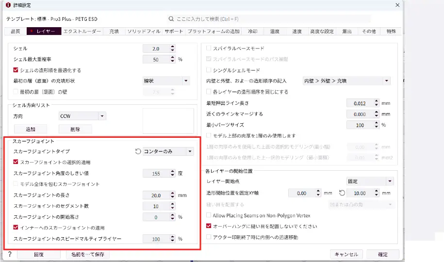 今回、対策としてideamaker上の機能である【スカーフジョイント】を用いることで解決を図りました。「造形テンプレート→詳細設定→レイヤー」から確認できる設定です。