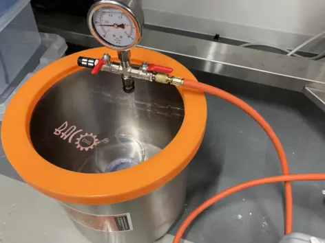 ※真空状態時は泡が勢いよく発生する為、負圧を掛けたまま放置すると容器からレジンが溢れ出る可能性があります。負圧中は目を離さず、溢れそうになった場合は負圧を止めるか吸気を開放することで泡を抑えることができます。