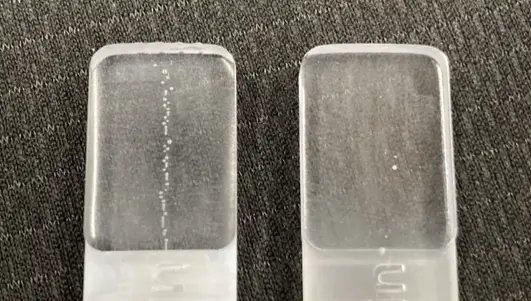 | 理由 | IPA/エタノール等で洗浄した直後はモデルの表面に付着した洗浄液によって均一な液体膜を形成し、光の屈折率を抑え透明な状態になります。 しかし、洗浄液が揮発・乾燥するとモデルの表面に積層痕の溝や突起が現れます。この微細構造が光を散乱させ半透明に見えてきます。 さらに小さな気泡や凹凸のある部分によっては光の散乱は強くなり透明度は低下します。 |