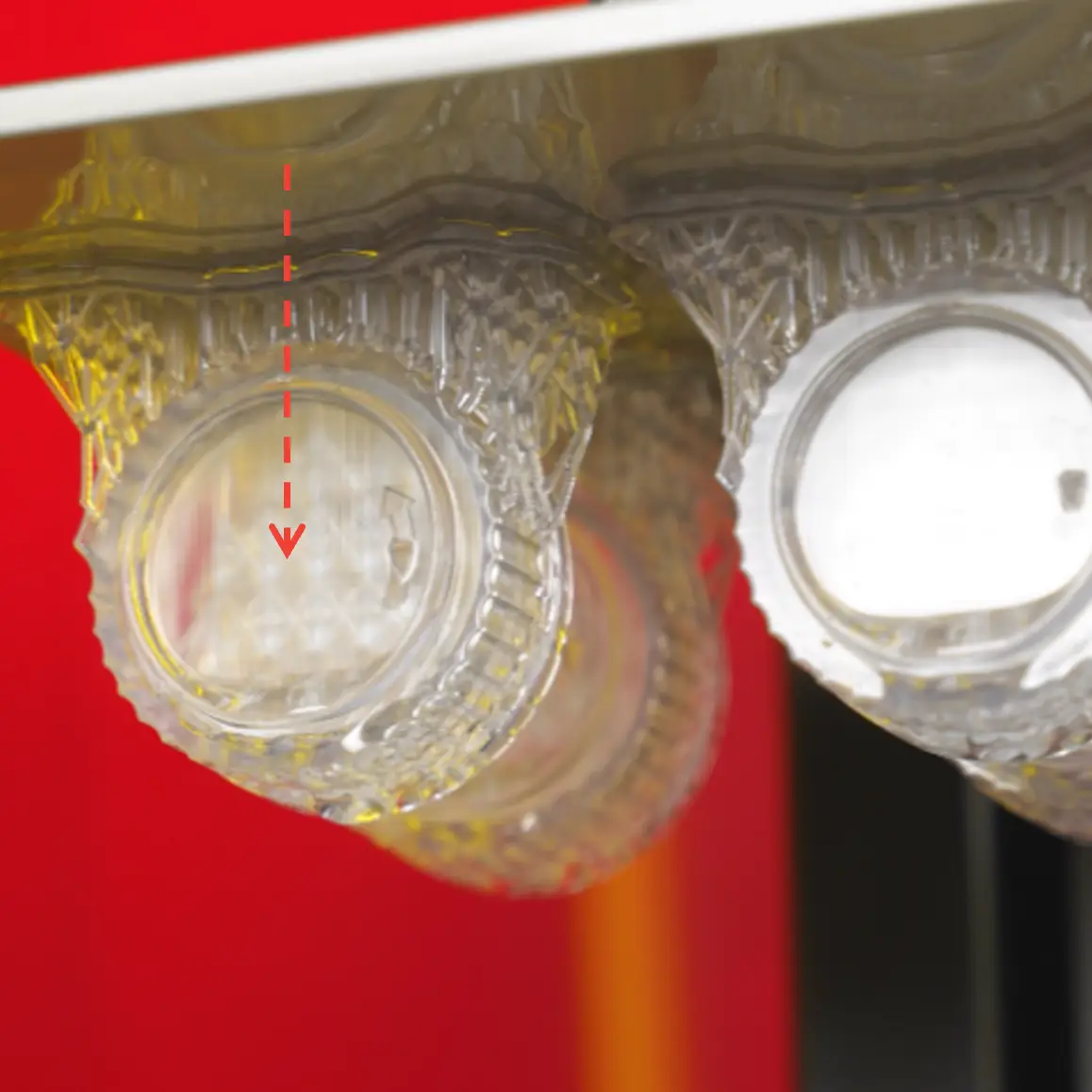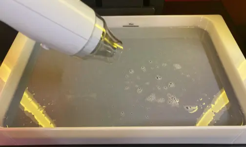 1.造形を行う前に、レジンを⼀定時間放置するかヒートガンを用いてレジンタンク内の液面に付着している気泡を取り除きます。気泡が大量に付着したまま造形を行うと透明度などの品質に大きく影響します。