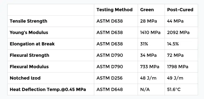 *試験⽚はRaise3D DF2 プリンター (厚さ100μm/5.5 秒) で印刷を行い、DF Cure の常温で5分間UV照射による二次硬化しました。