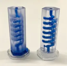 色味の変化はモデルの厚みに関係しています。Raise3D High Clear Resin自体は青色で画像左側の比較的厚みのあるボトルとパイプ形状は青く見えます。