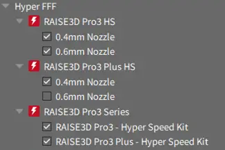 プリンター型式の左側に表示される稲妻マークは、そのプリンターがハイスピード造形に対応していることを示します。具体的には、HS機やHyper Speed Kit対応機などが該当します。