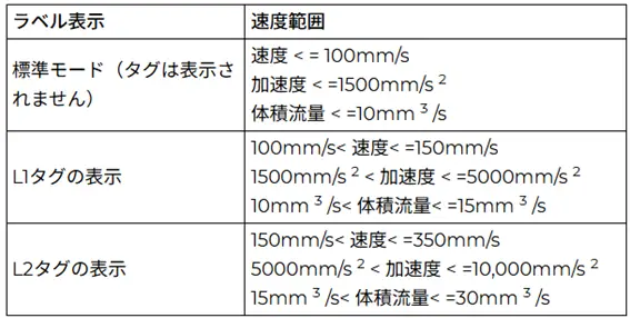 一般的に、L2タグが付いたテンプレートが最も速く造形できます。ただし、ハイスピード造形対応フィラメントでも、高精度設定などではタグが付かない場合があります。