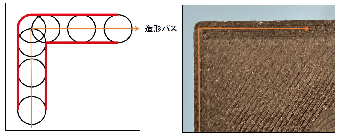 吐出されたフィラメントが直角に動いた場合、内側の角は直線と直線がぶつかって角ができますが、外側の角は直線と曲線がつながり、角が丸くなってしまいます。