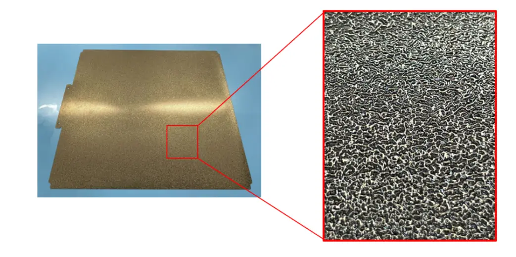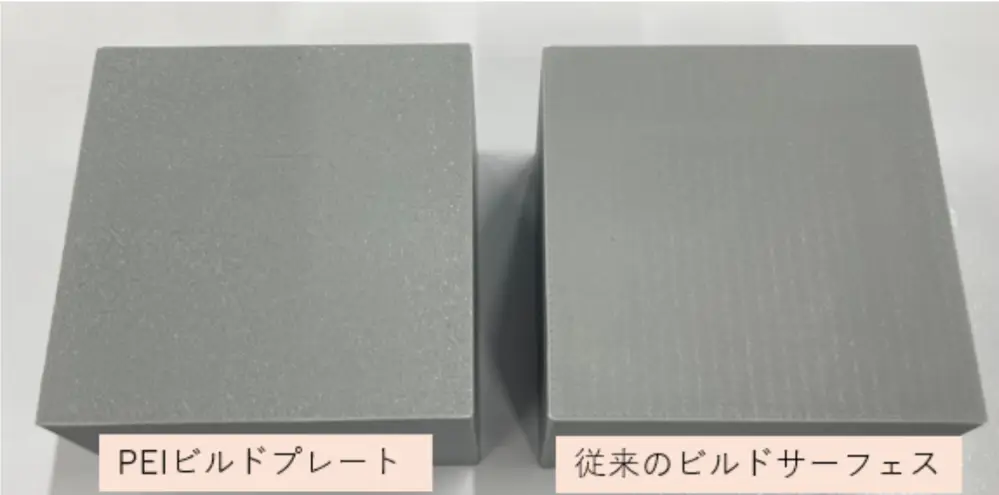 従来のビルドサーフェスとPEIビルドプレートを比較した時、まずその見た目、手触りの凹凸が気になると思います。この梨地のような凹凸がPEIビルドプレートへの定着を良くする一つの特徴です。