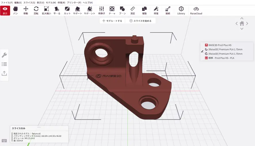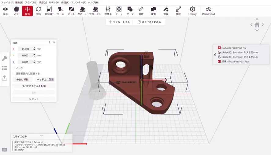 ※モデルの左側にデュアル造形で使用するワイプタワーが出現しますが、この位置は無視していただいて構いません。