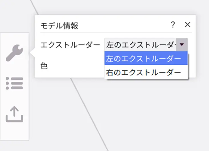 「モデル情報」のパネルに戻り、モデルを選択し、エクストルーダーの項目を「左のエクストルーダー」に戻します。