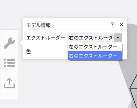 モデルを選択し、エクストルーダーの項目を「右のエクストルーダー」に変更します。