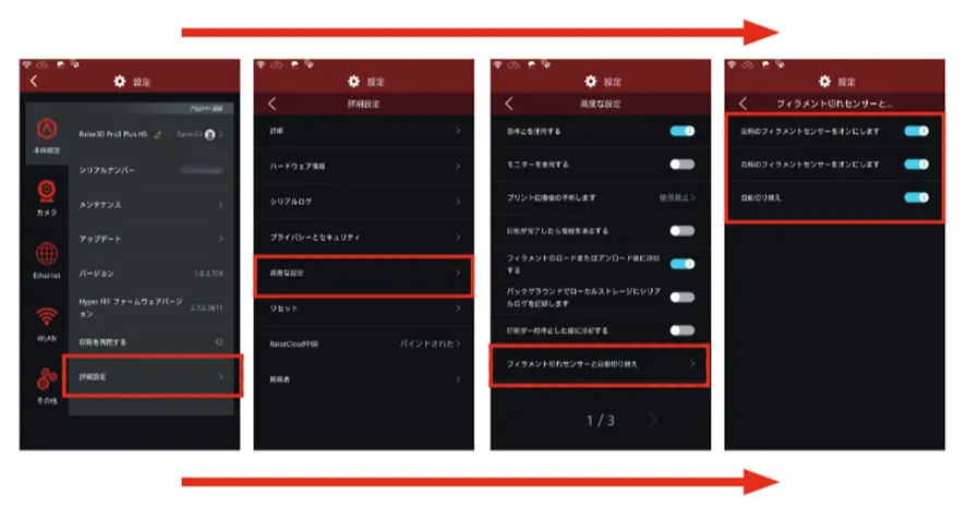 下記の矢印に従って、画面を遷移しフィラメント自動切り替え機能を ON にします。
