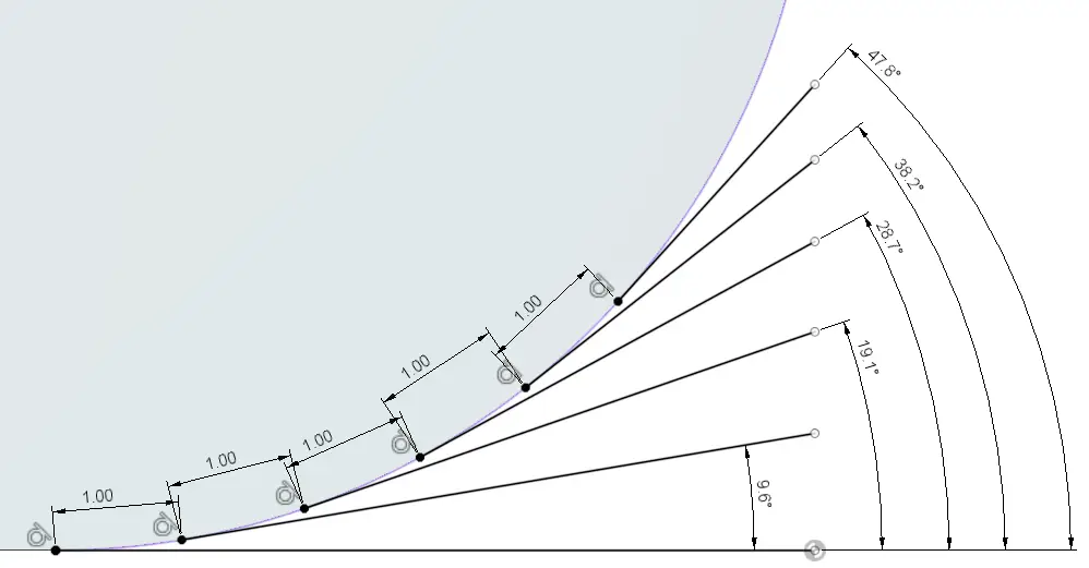 フィレットライン上からフィレットに沿って接線を書いてみます、そうすると面の角度を見ることができます。