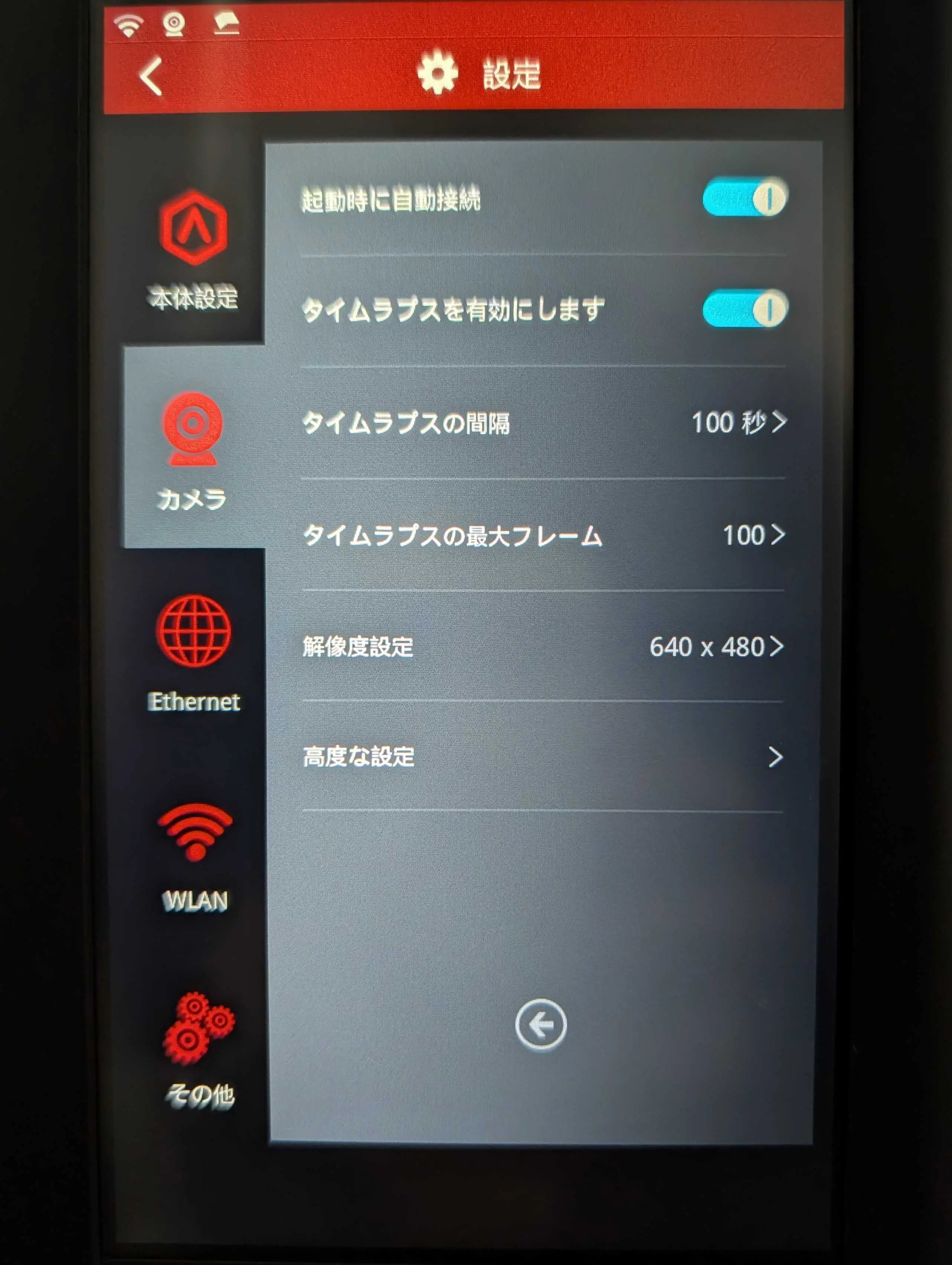 - 起動時に自動接続:プリンターを起動した際カメラを自動的に有効にします。