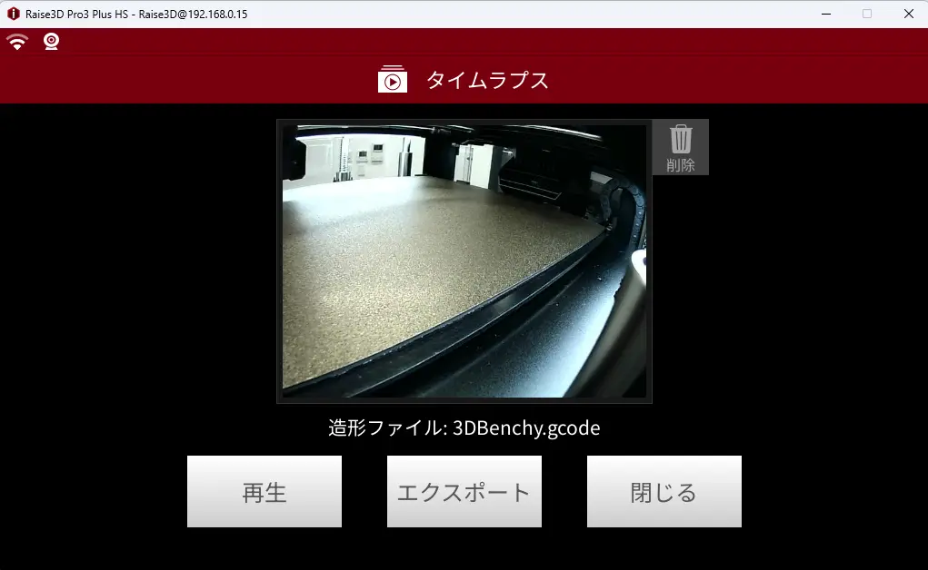 タイムラプスはコマ送りで造形状況の撮影、記録ができる機能です。