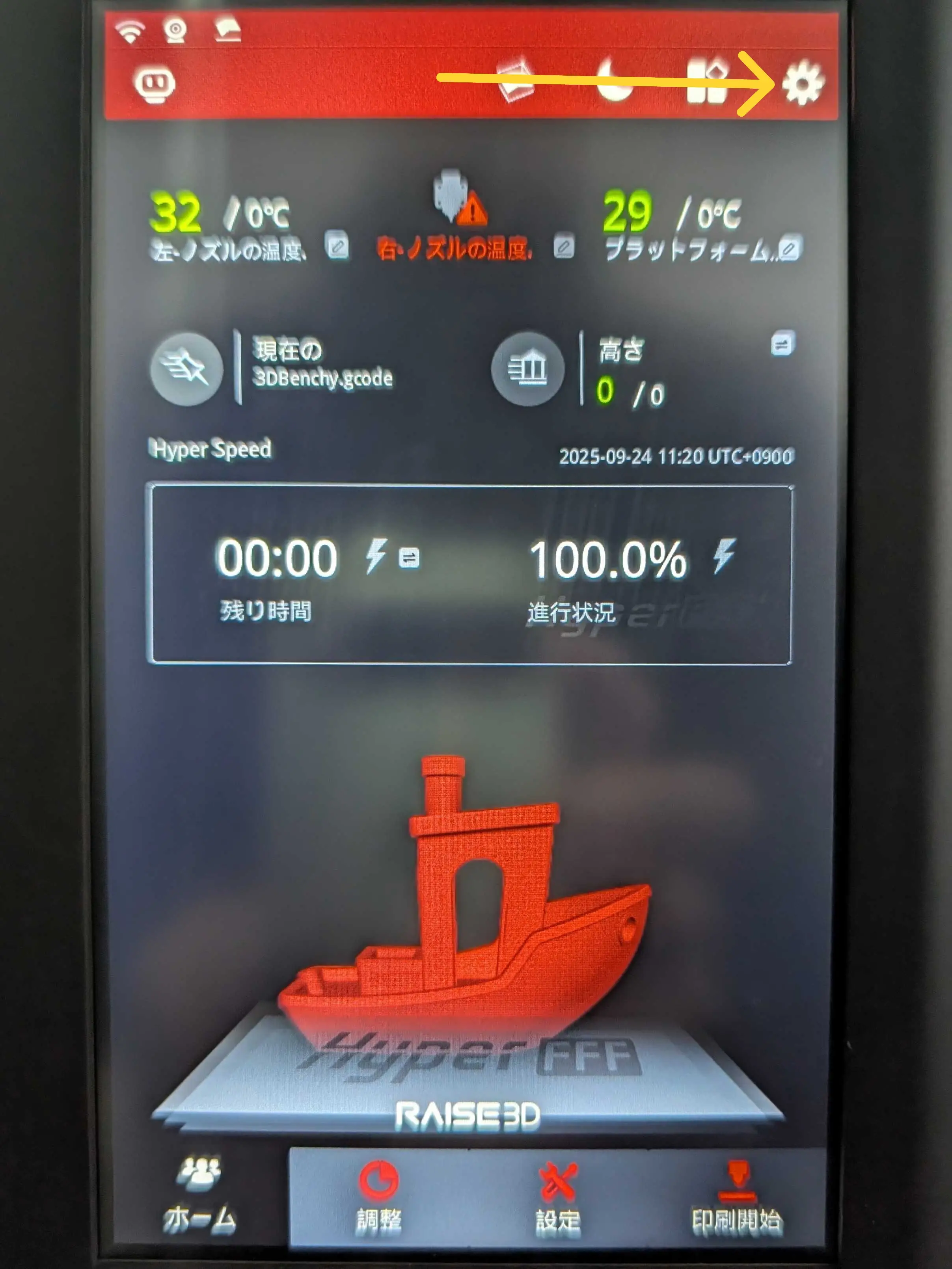 まず、プリンターの画面で右上の歯車マークをタッチします。