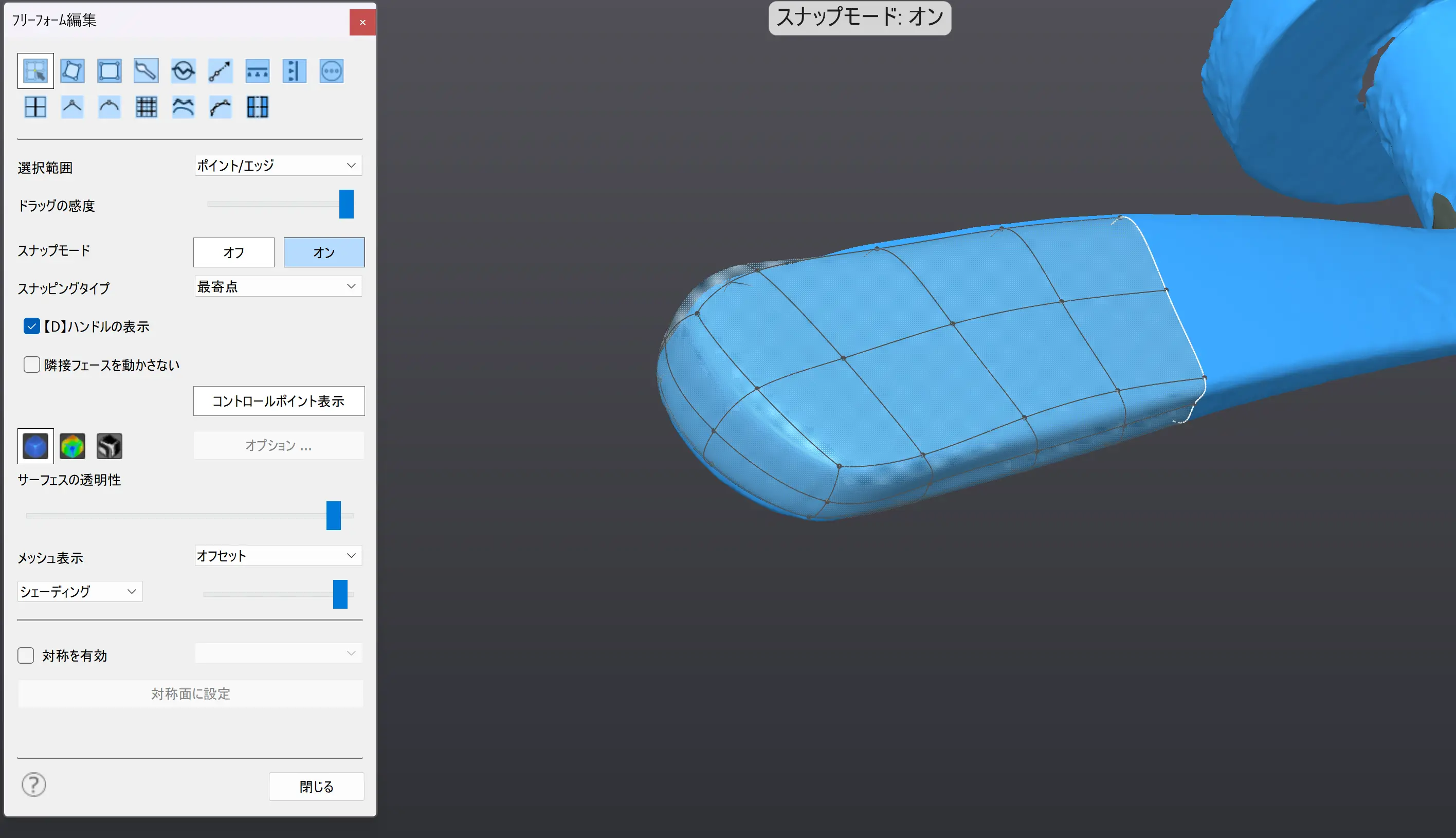 このようにスキャンデータの表面をクリックしていくことで滑らかな曲面を作成することができます。今回のような曲面形状を得意としていますが、機械的なブロック形状ももちろん作成可能です。これらの組み合わせにより多岐にわたる形状に対して柔軟に対応できます。
