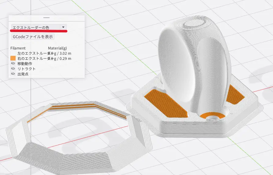 オレンジ色で表示されている部分が右ノズルで造形される部分です。