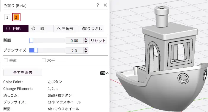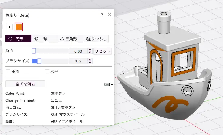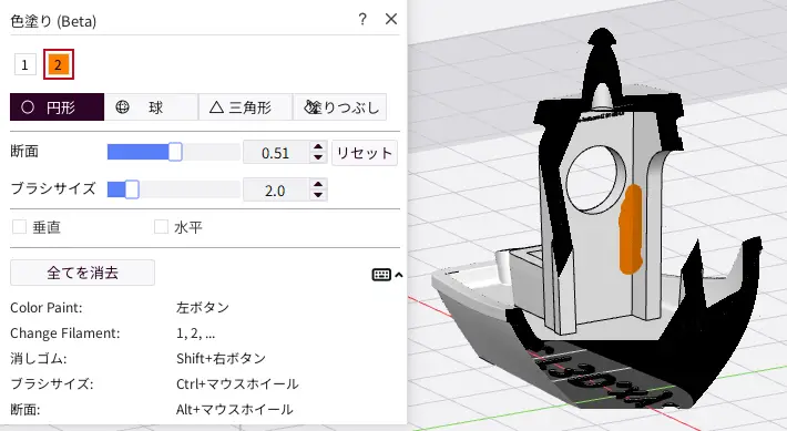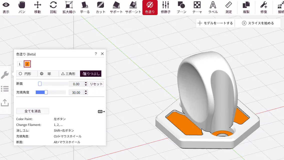色塗り機能は、3Dモデル上の任意の領域を直感的に「色塗り」するだけで、その部分を別の色で造形するためのスライスデータを自動生成します。