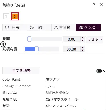 ④充填角度:塗りつぶしの選択ツールを選択した時のみ選択が可能です。