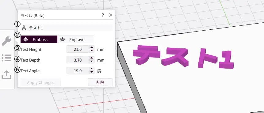 テキストを入力し、サイズ、深さ、位置や角度を調整し、「適用」を押します。