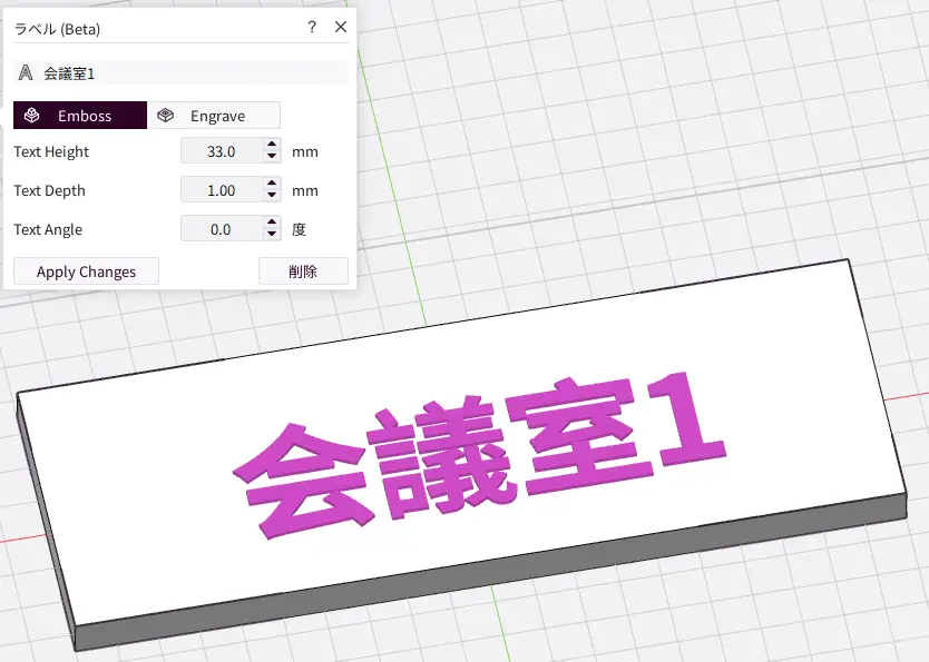 例えば、「会議室1」のプレートのようなシンプルな板状のモデルや、円柱、直方体といった基本的な形状であれば、ideaMaker内でサッと作成し、その場でラベル機能を使って文字を入れることができます。