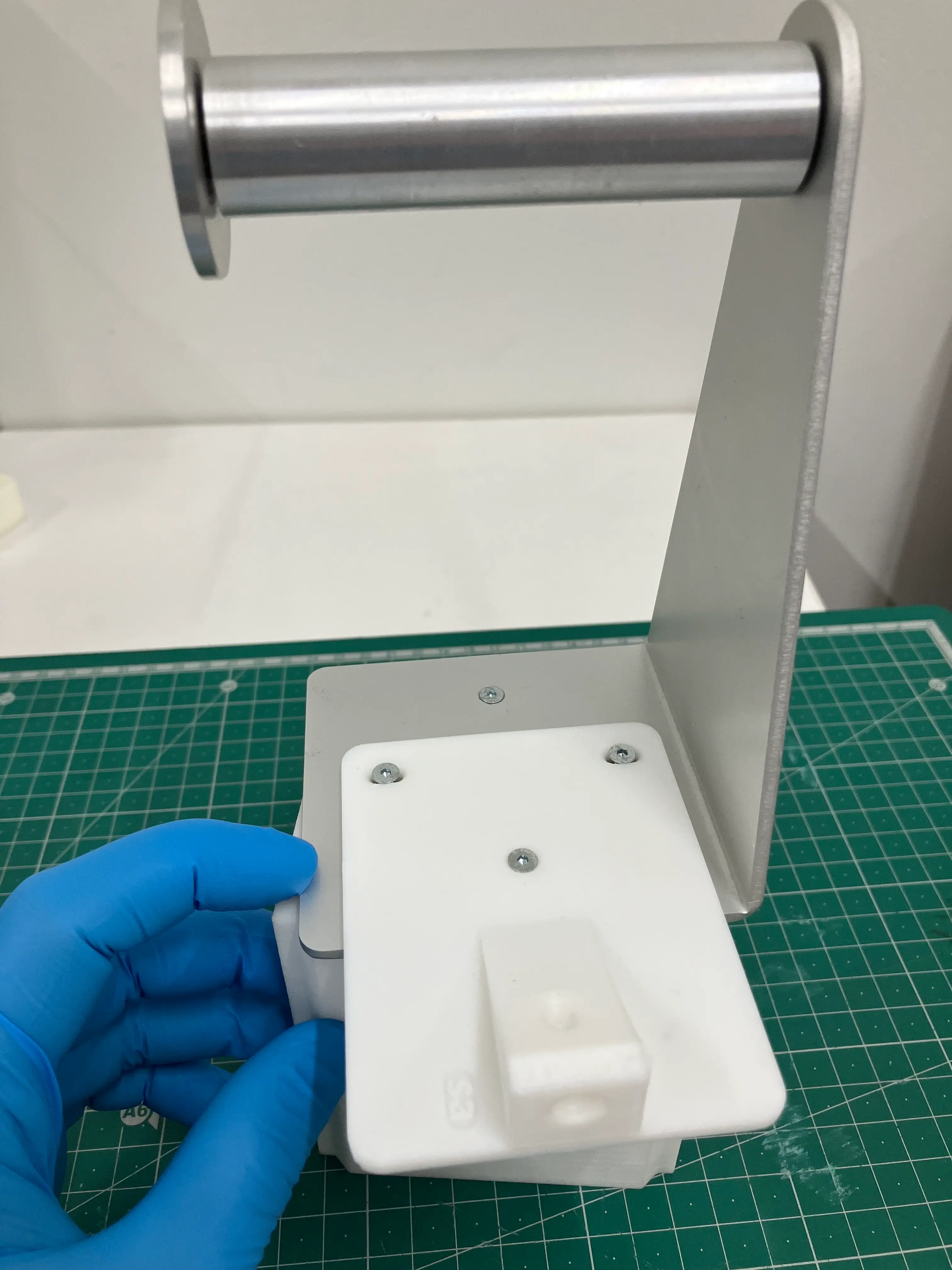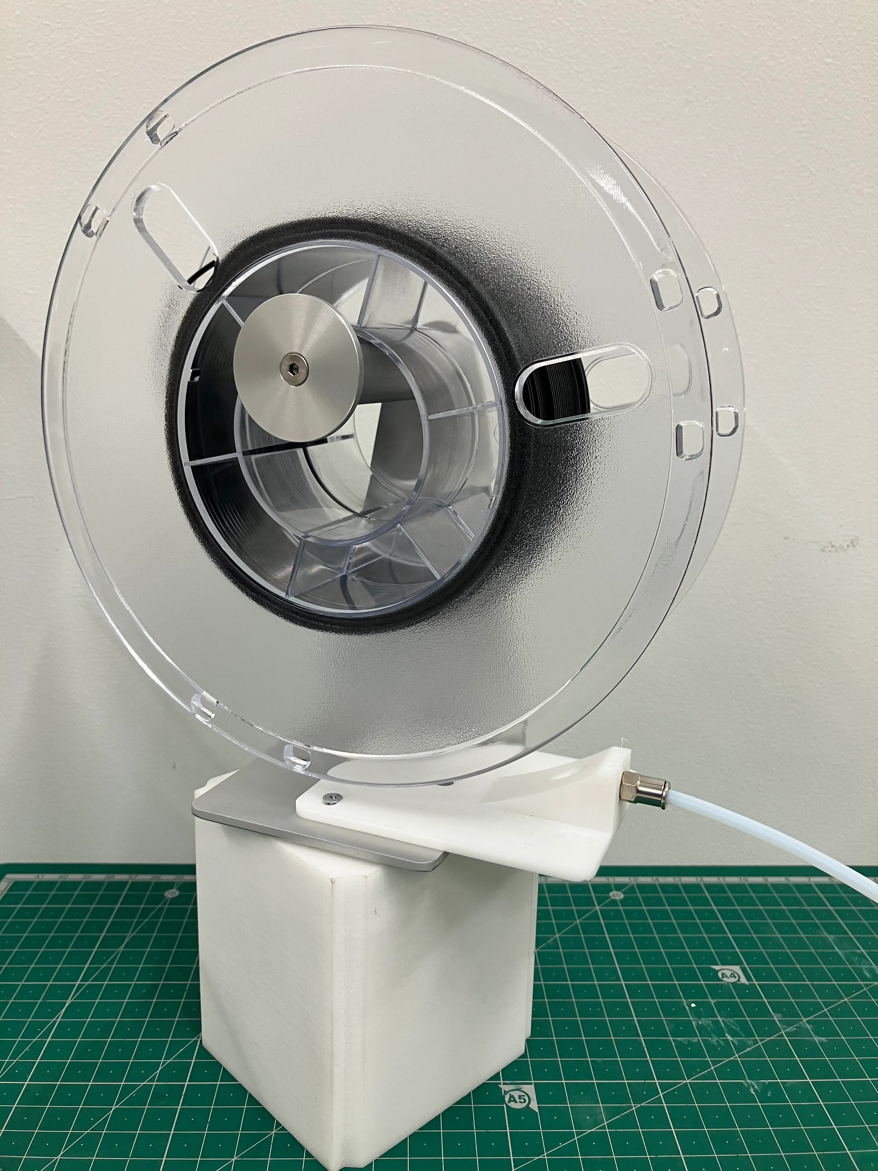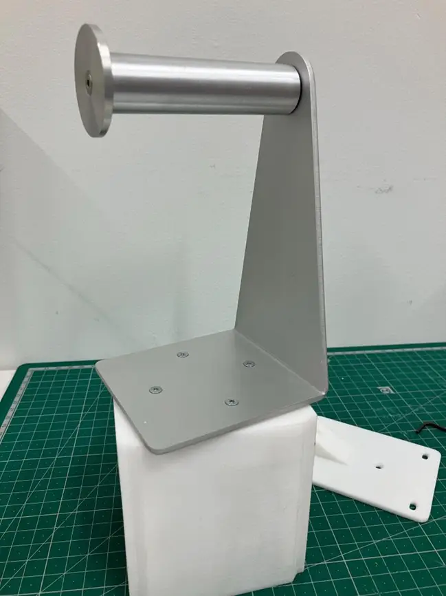 問題点であった、材料の絡みでの失敗を防ぐための部品として、「首振りフィラメントスタンド」の改善を行いました。今回の印刷時間は約1時間でした。このように、短時間で問題解決の術を得られると、いろいろと社内改善の治具も試してみたくなりますね。
