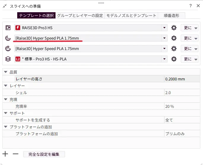 スライサー(ソフトウェア)上で選択された材料テンプレート