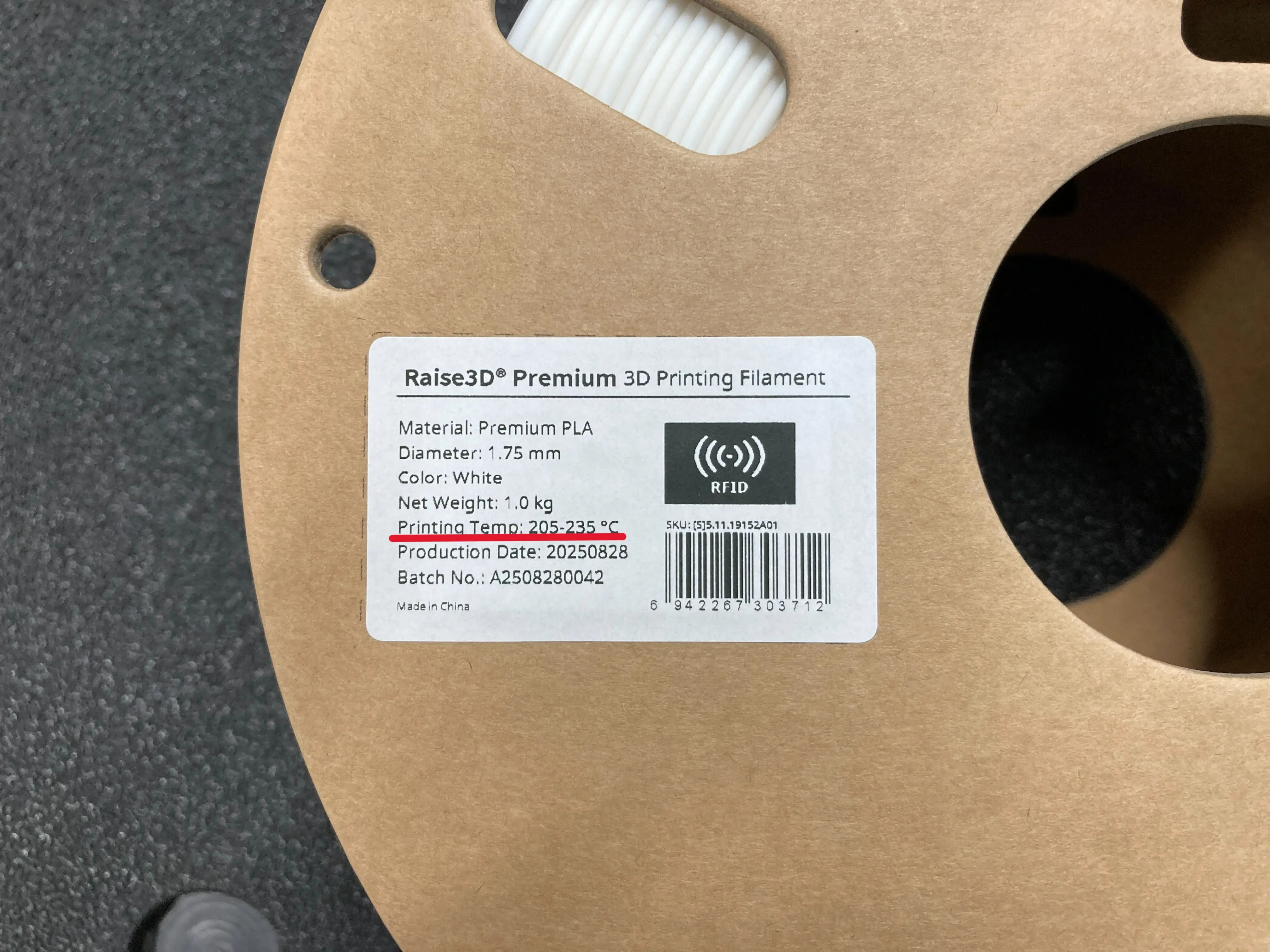 材料メーカーによって表記は異なりますが、フィラメントスプールや付属物に温度帯が表記されています。