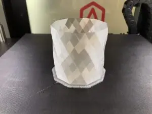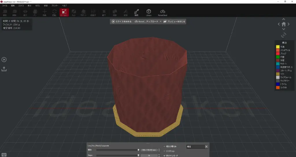 造形手順は以前ポリプロピレン(PP)を造形した時と同じスパイラルベースモードの壁一層で造形していきます。